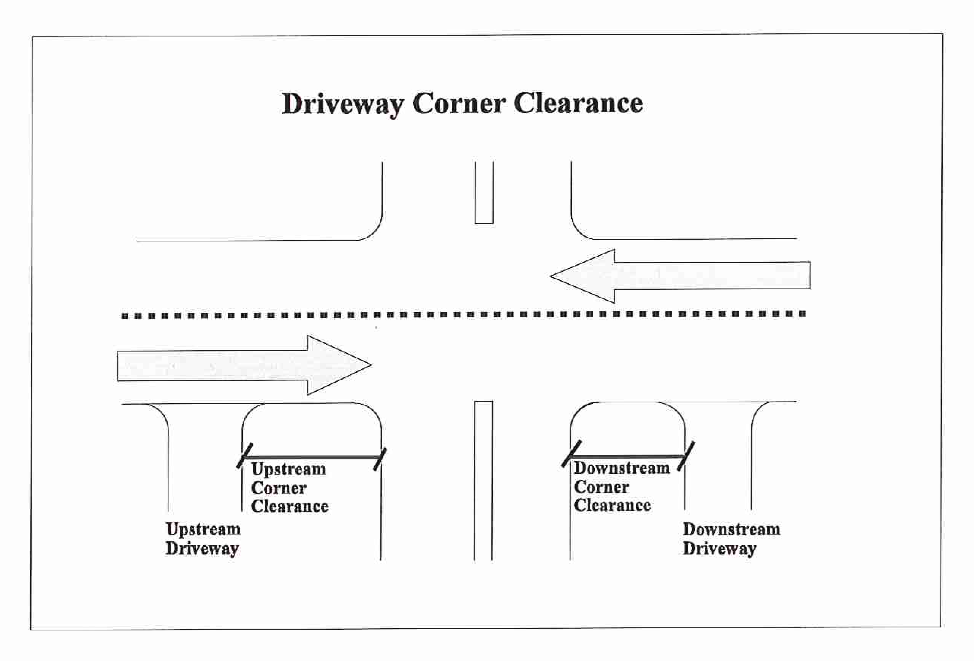 Driveways Adjacent to Intersections. The minimum distance from the intersection to the nearest driveway shall be according to the following intersection illustration and distance table. (Distances are measured from the back of curb to the throat of the nearest edge of the driveway.)