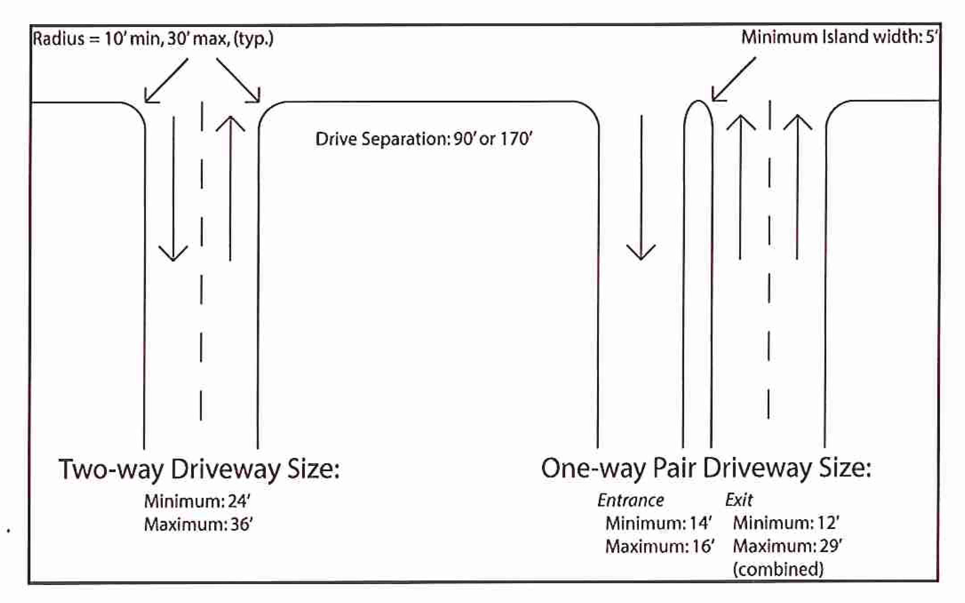 One-Way Paired Driveways. Where a driveway is of the split, one-way paired directional type, there shall be a raised landscaped island of at least five feet in width between the two driveways. The size of the entrance shall have a minimum of 14 feet and a maximum of 16 feet. The exit lanes shall be a minimum of 12 feet and a maximum of 29 feet (combined).
