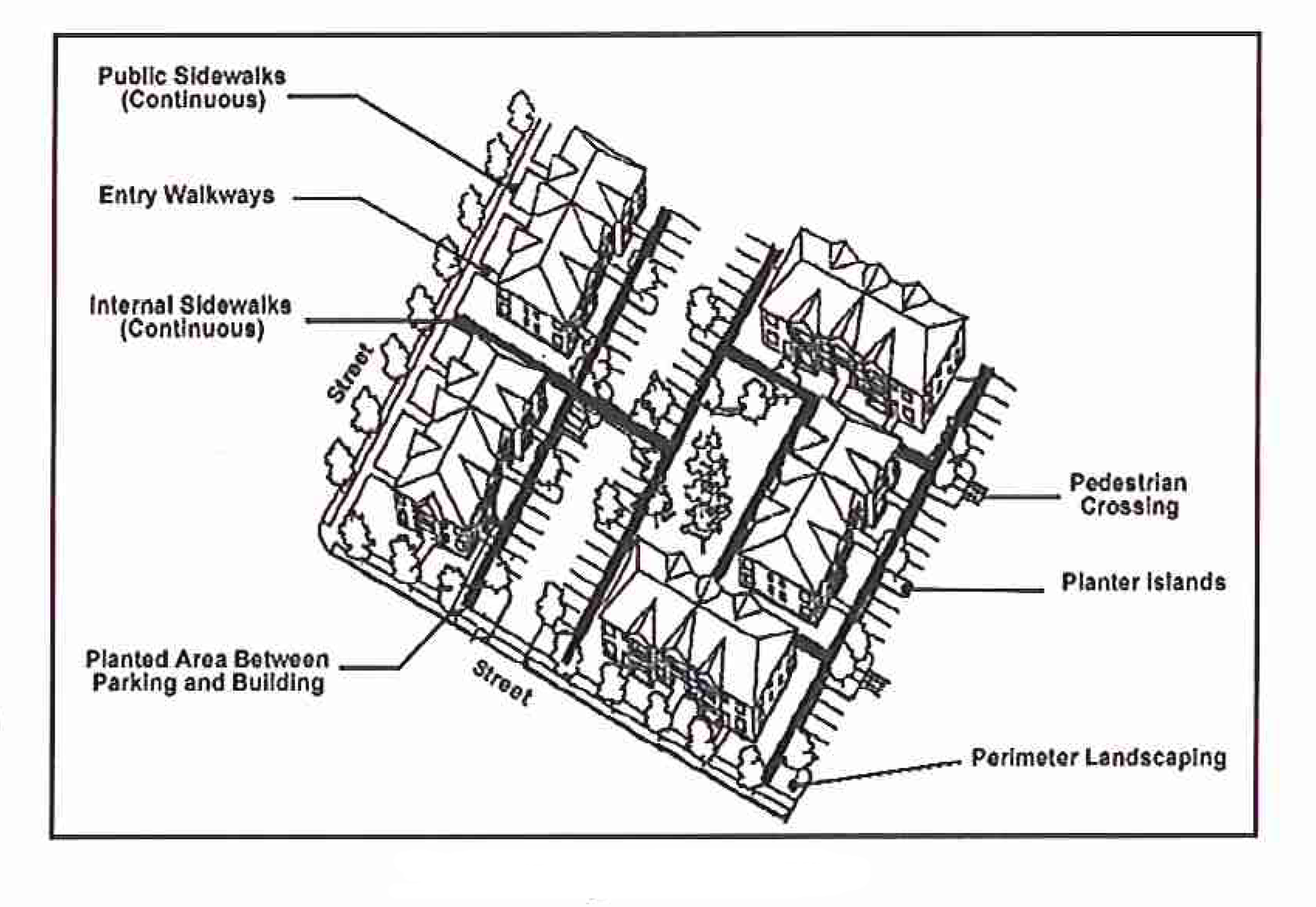 Pathways Encouraged to be Raised. For the purpose of pedestrian safety, pathways through parking lots are encouraged to be raised on a six-inch-high curb, with the exception of areas crossing driveways.