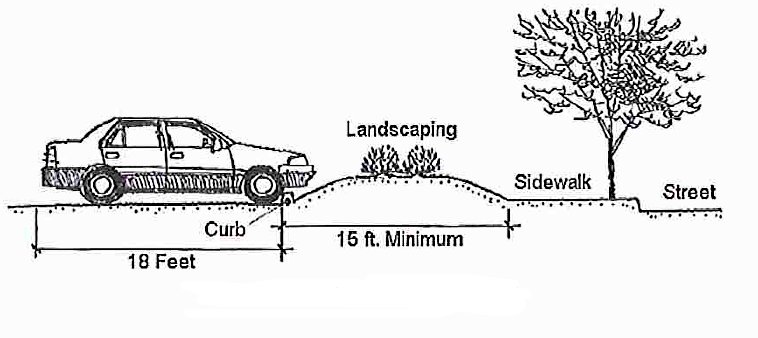 Vehicle Separation from Pathways and Access Ways. Pathways and access ways adjacent to a driveway, street (public or private), or parking spaces are encouraged to be raised six inches and curbed, and be separated from the driveway/street by a buffer strip with a minimum width of 11 feet (combined landscaping and meandering walk), utilizing bollards, lighting, landscape berming, or other physical barriers. The ends of the raised portions must be constructed with accessible curb ramps.