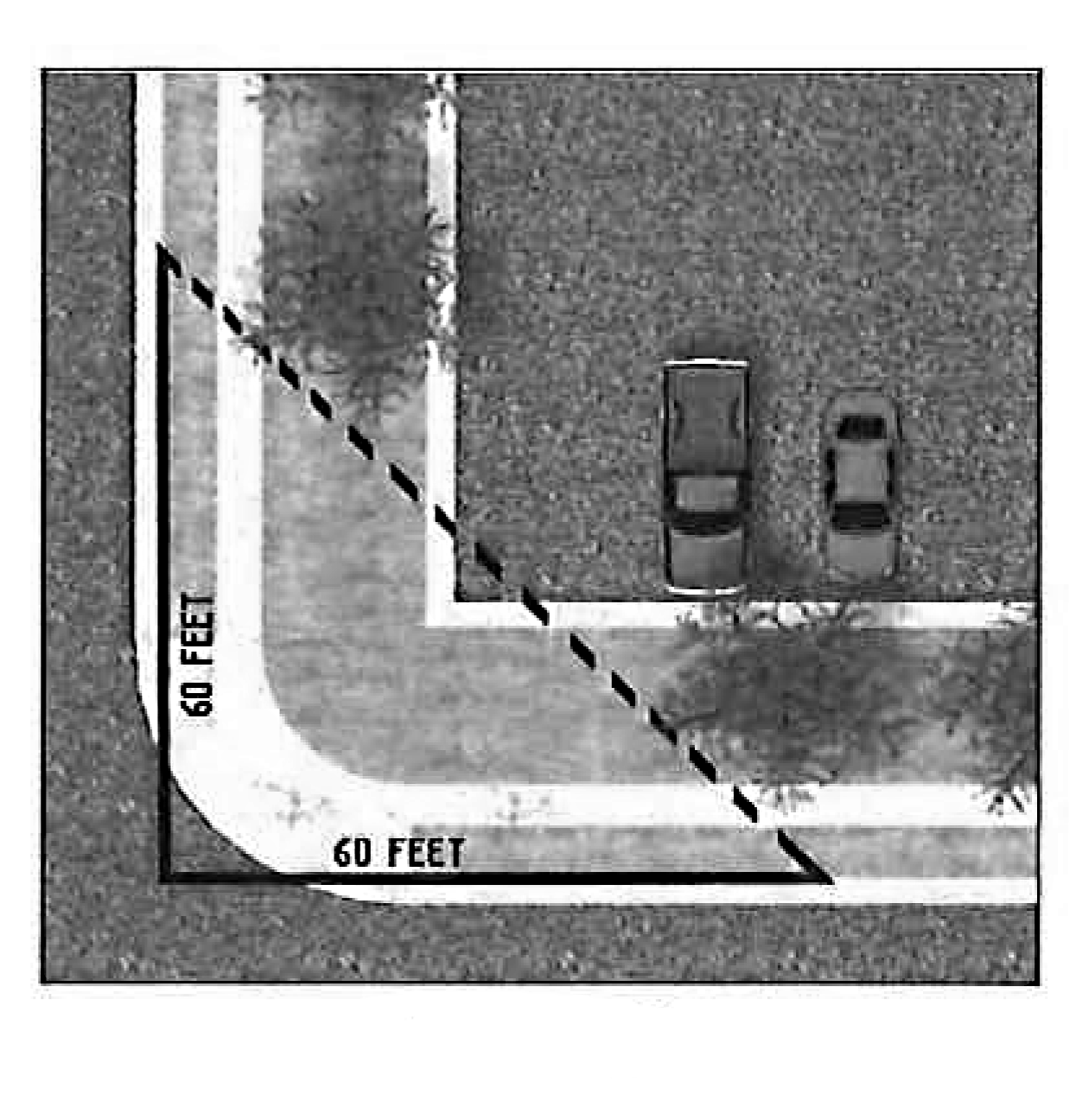 Visibility Triangle. No sign more than three feet in height (above the top back of curb) shall be erected near any driveway or intersection for vehicular traffic within a triangular area formed by the intersection of straight lines extended from the back of curb (or a future curb) and a line connecting them at points 60 feet from the intersection of the lines (see Figure 2). Deviations from these requirements must be reviewed and approved by the City Transportation Engineer.