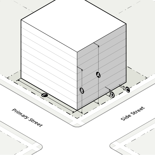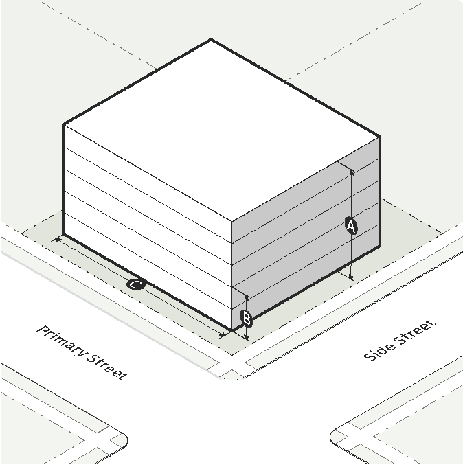 PX-10/12: Perimeter Mixed Use 10 stories maximum base height, up to 12 stories with bonus.