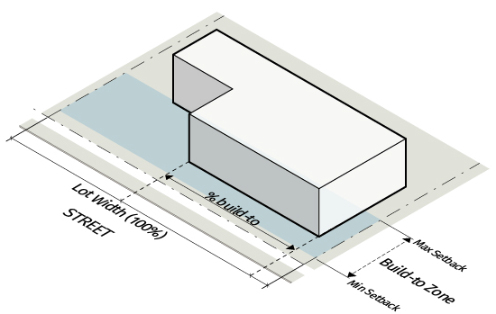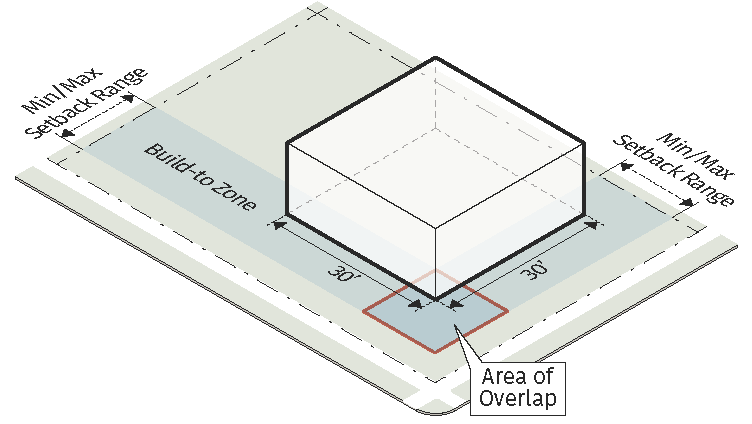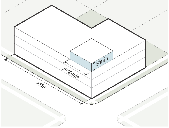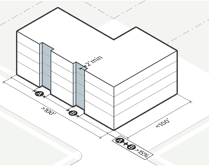 For buildings 100 feet or more in length, at least 2 portions of the street-facing building façade must have a variation in setback of at least 2 feet. The combination of the required variations in setback must total no less than 15% of the length of the building.