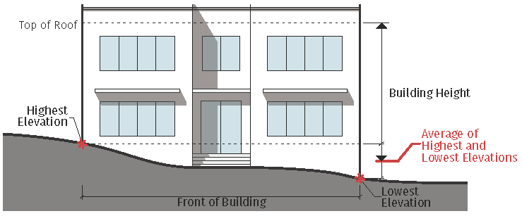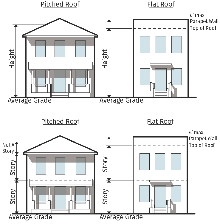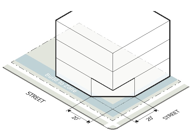 Articulation in Building Height For buildings 100 feet or more in length, at least 15% of the street-facing roof line must have a variation in height of at least 5 feet. On a corner lot, the variation in height must be located at the corner of the building that addresses both street fronts. A parapet that meets the requirements of this Development Code may be counted toward this articulation requirement. Signs are not allowed above the roof line, and do not count toward this articulation requirement.