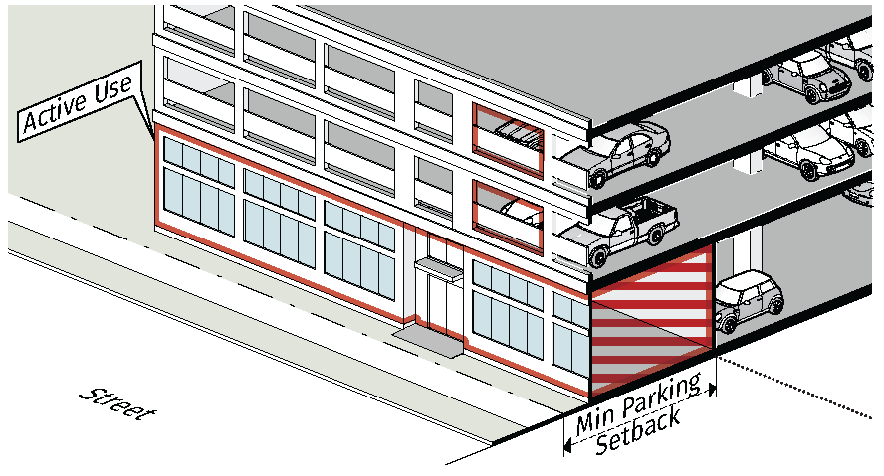 Commercial-Active Space Where required by the zoning district or use. the ground story must be constructed to meet or exceed the minimum requirements for ground floor elevation, ground story height. transparency. and entrance spacing required for a retail or commercial use. Commercial-active space is restricted to only commercial use.