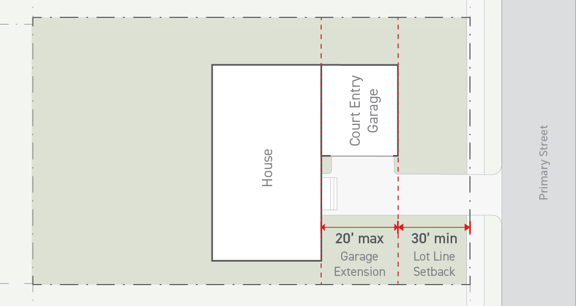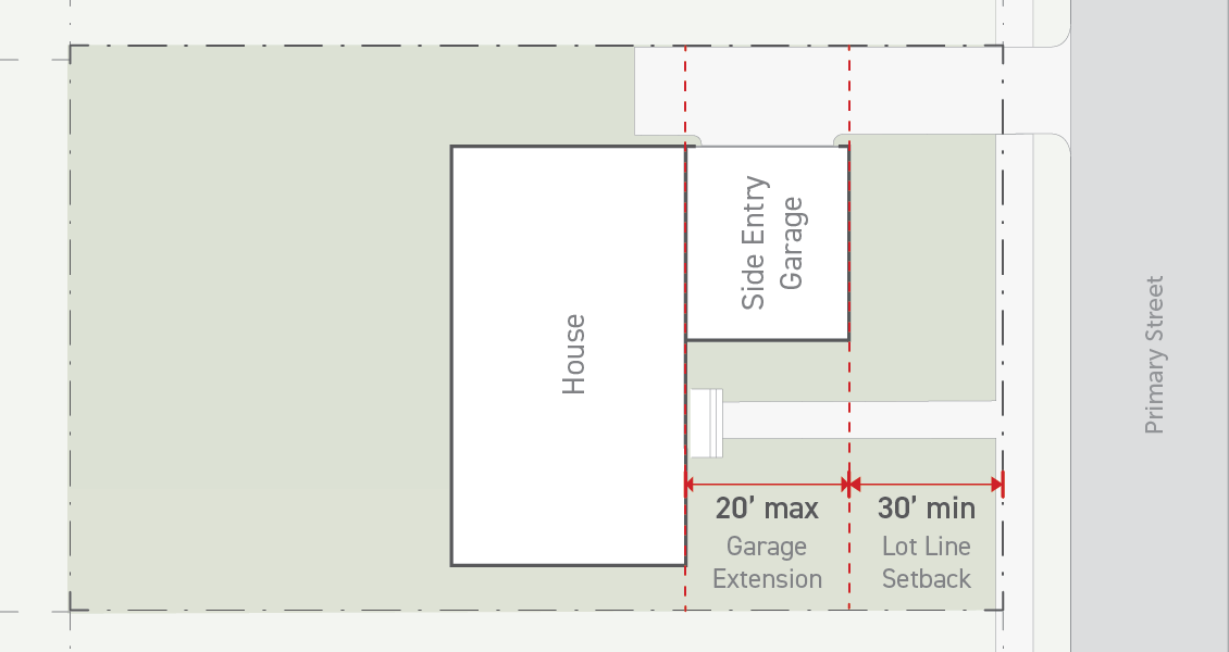Garage doors or carport entries must be positioned at least 5 feet behind the front wall plane of the house, extending no more than 40% of any street-facing width of the house. This requirement does not apply to side-entry garages. Architectural finish and windows must be provided for any side-entry garage wall facing a primary or side street.