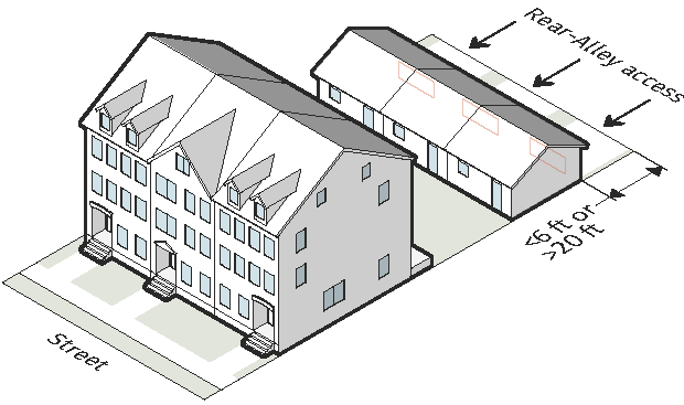 Garage must be placed entirely to the rear of the townhouse and be rear-accessed (loaded). Garage may be attached or detached.