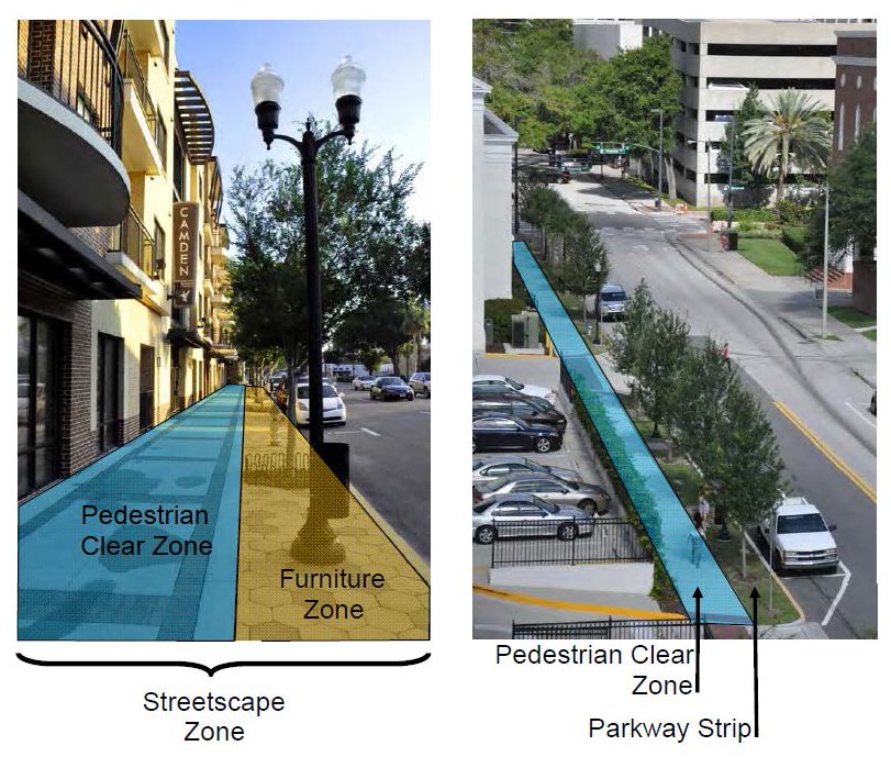 Right-of-way uses shall maintain a clear pedestrian zone of six feet minimum at all times. In areas of higher pedestrian traffic or activity, or in conditions that suggest the need for additional clearance, all as determined by the city, a clear pedestrian path greater than six feet may be required by the city. This area shall be free of any obstructions such as trees, parking meters, utility poles and the like in order to allow adequate pedestrian movement.