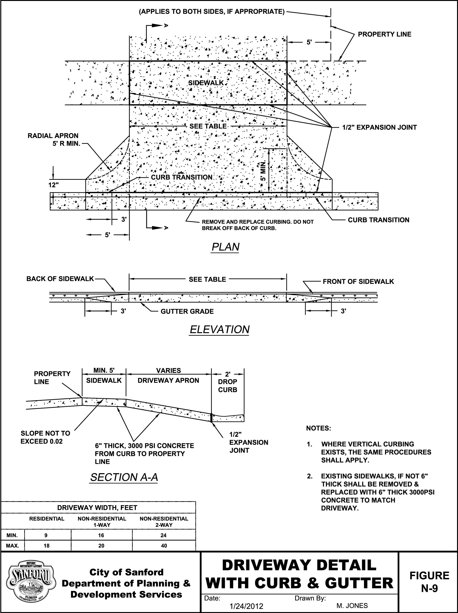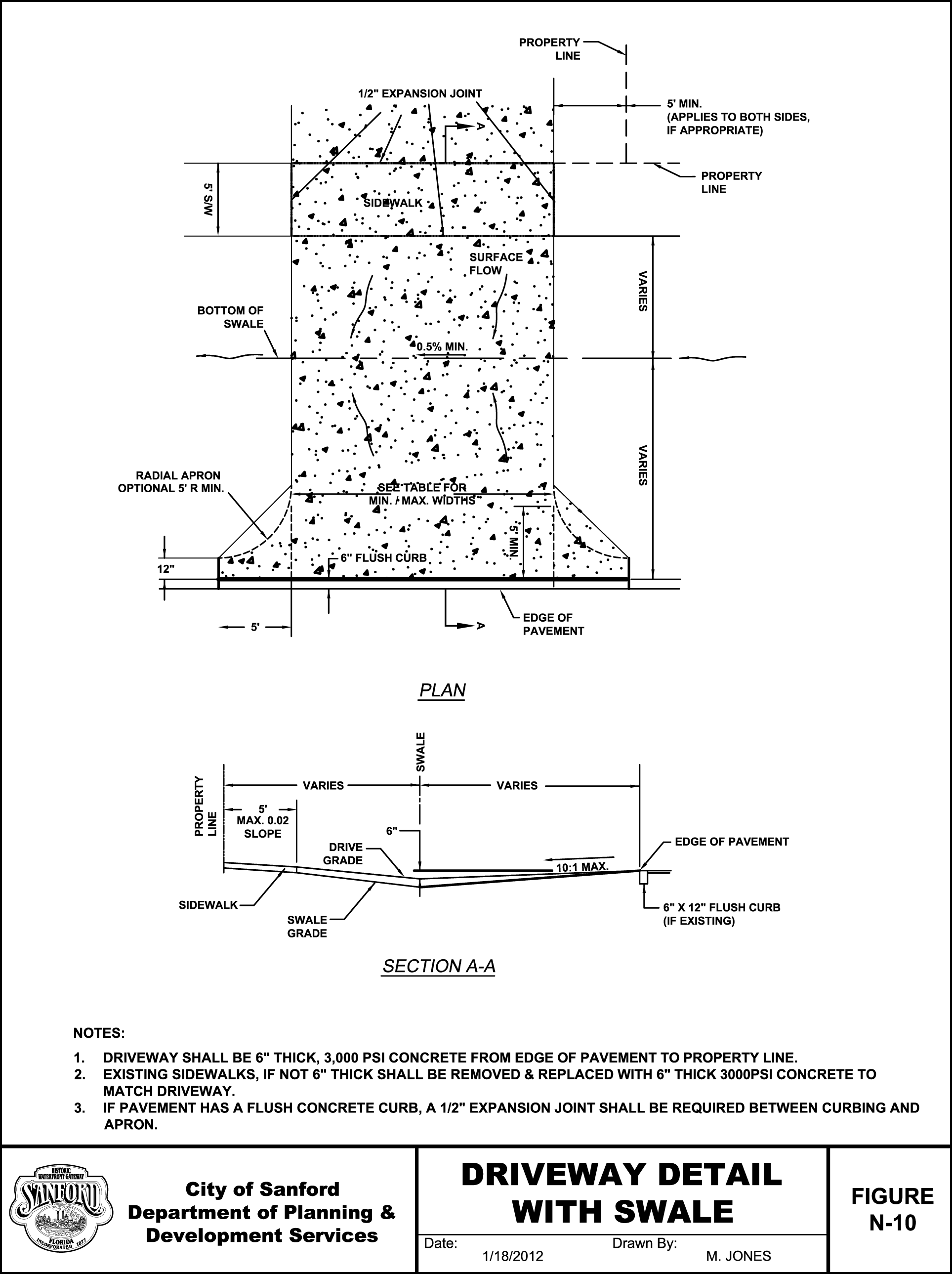 Driveway Design. Driveway design will vary depending upon a number of conditions including functional classification of the accessed roadway, land use requiring the driveway, projected ADT and/or peak hour traffic using the driveway, vehicle type(s) using the driveway, speed limit of accessed roadway and other design features of the site itself or surrounding area. See figures N-9 and N-10 for details of driveway design.