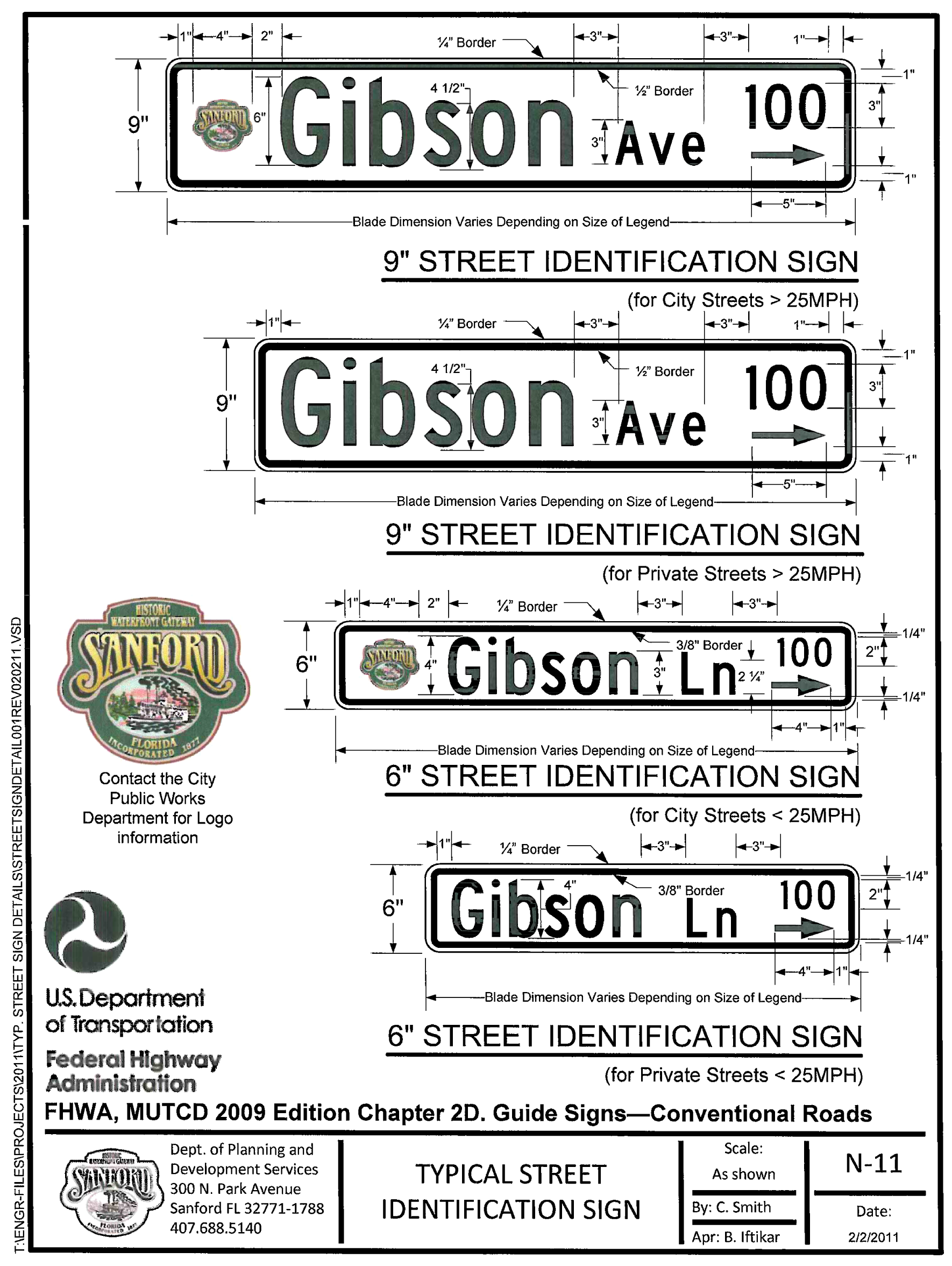 Street Identification Signs. Street identification signs which comply with the following specifications shall be installed by the developer at all street intersections (See Figure N-11).