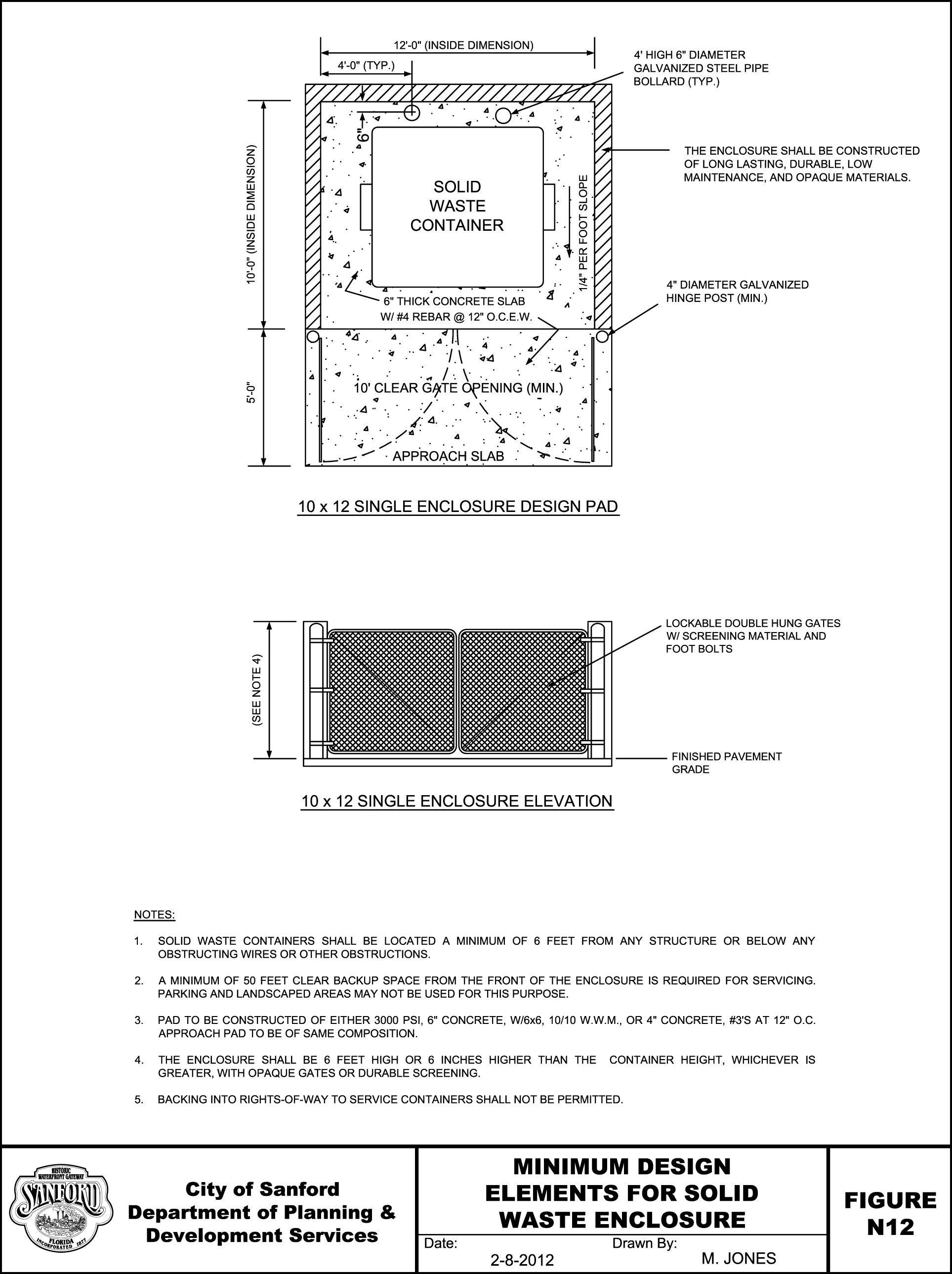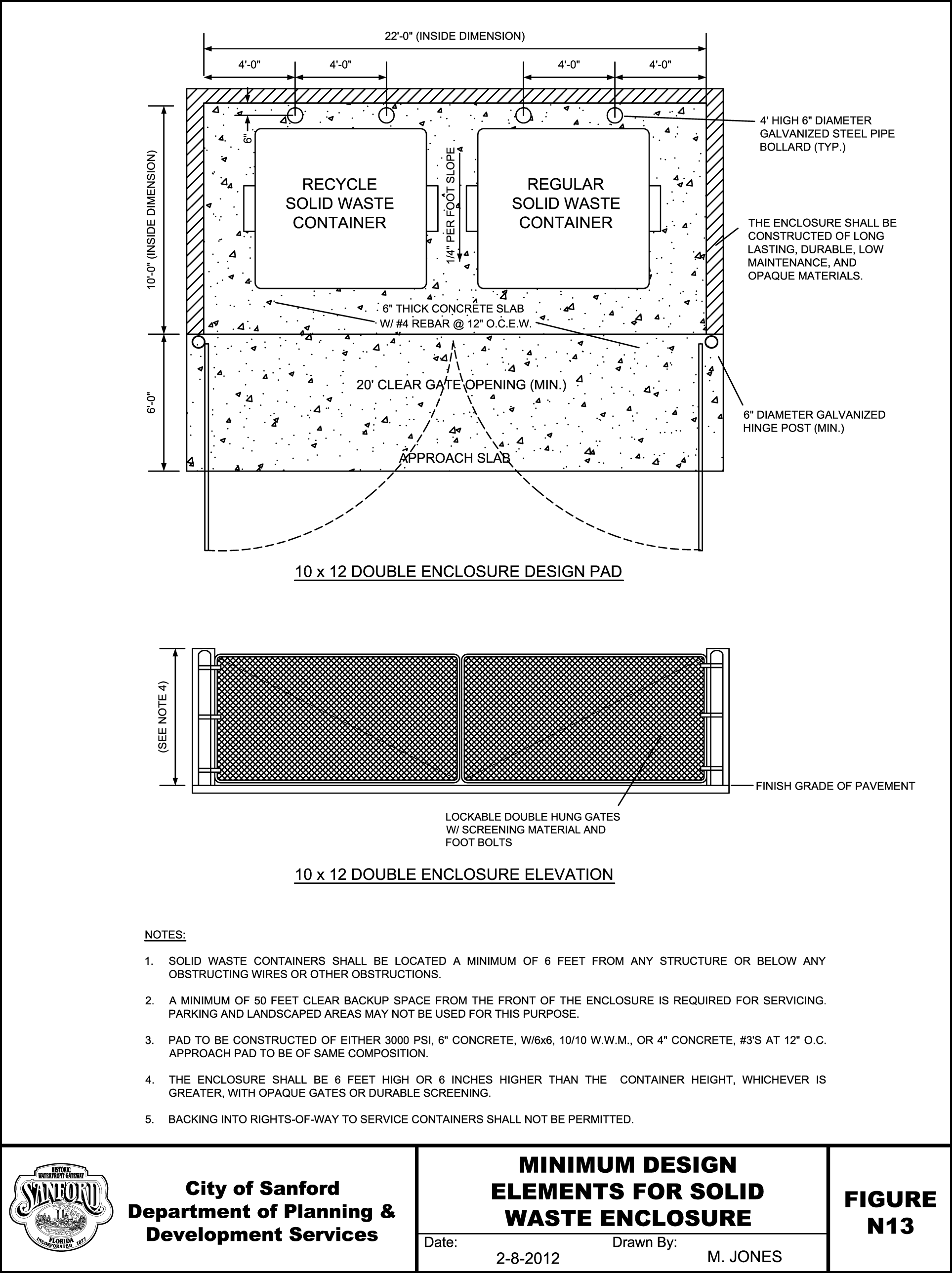 Container Pads. FEL refuse container pad(s) shall be provided for all rear end loader containers and shall be constructed either of, as a minimum 3,000 PSI concrete 6" inches thick with 6" x 6" - 10' x 10' wire mesh or #3 steel reinforcing bars on 12" centers in each direction, or as approved by the City upon a finding being made that the reduction is necessary to provide property rights enjoyed by others in the same zoning district, and will not be detrimental to public health, safety and welfare. A 6' long approach slab of identical width, thickness, and composition to the container pad shall also be constructed adjacent and of equal slope to said pad(s).