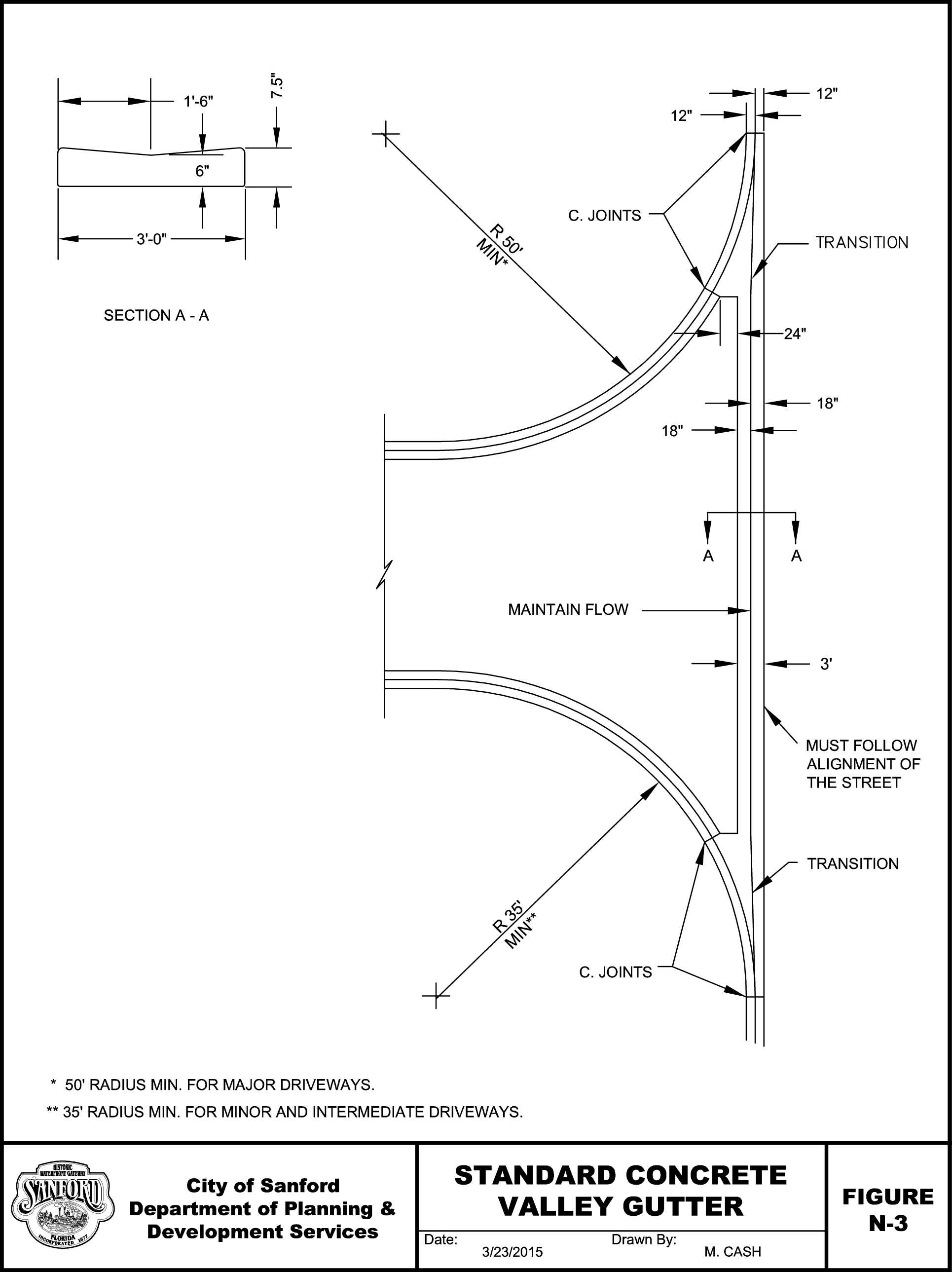 Intersection Improvements. Street improvement at intersections shall include the use of a concrete valley gutter in conformity with specifications illustrated on Figure N-3, unless the applicant can demonstrate that there will be no drainage flow across the driveway from adjacent gutters.