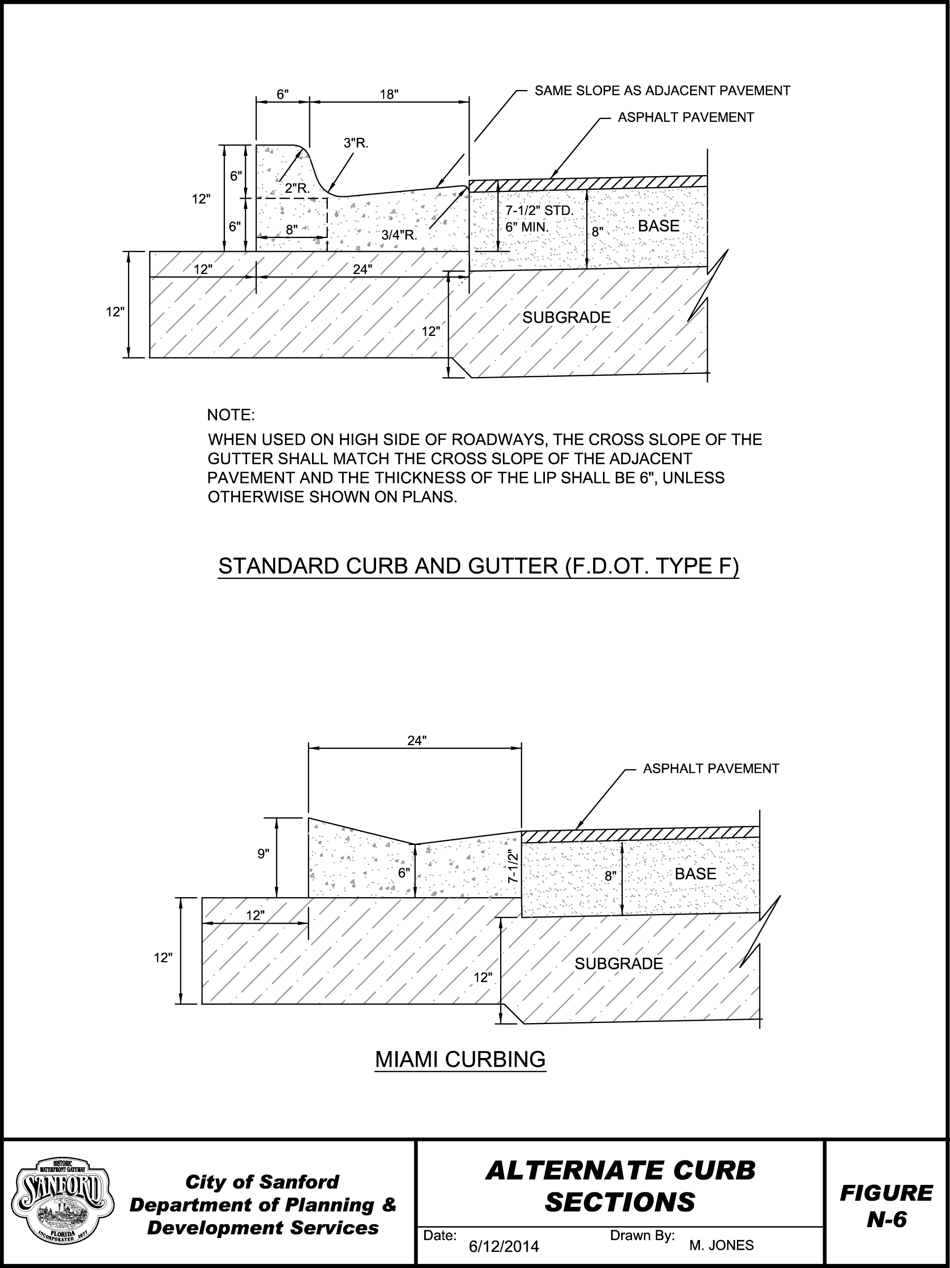 Curb and Gutter Required. All streets shall be provided with curbs. Standard curb and gutter (Type F) or Miami curb types shall be utilized for all streets provided that flush curb types shall be permitted when rural type street sections are utilized. Curbs shall be of integral type and shall conform to specifications illustrated on Figure N-6. Construction of curb and gutter of materials other than Portland Cement concrete shall not be acceptable.