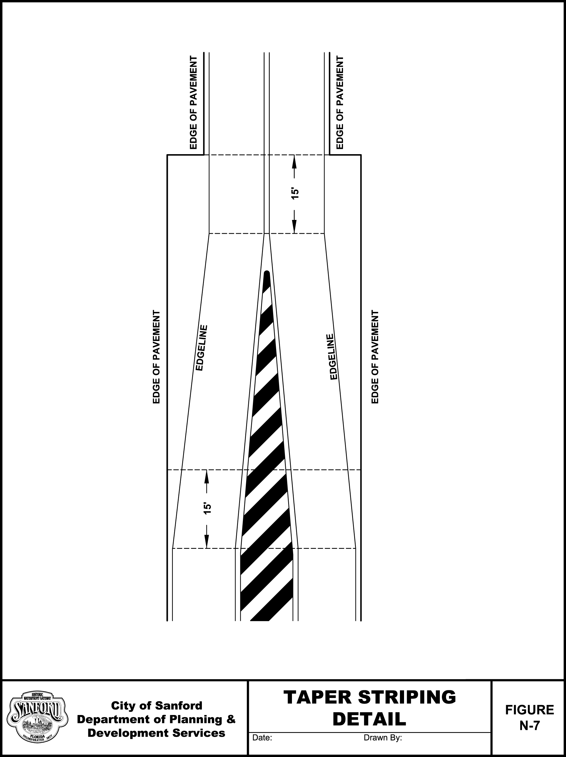 Additionally, if either terminus of the of the proposed auxiliary lane section is within 300' from an existing auxiliary lane terminus than a total 36' section is required to eliminate weaving or "Hour Glass" sections. See Figure N-7, Taper Striping Details, for design and markings specifications.