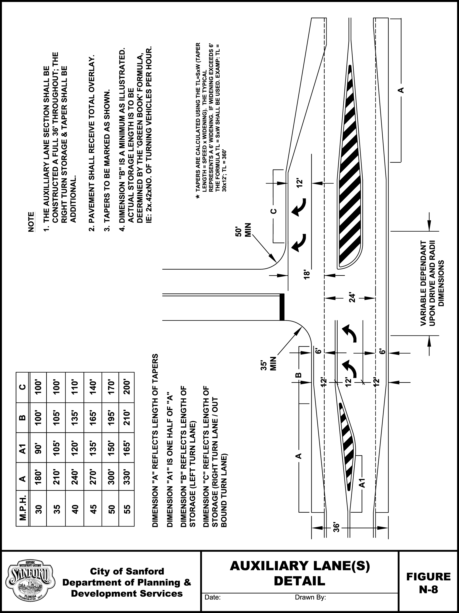 Figure N-8, Auxiliary Lane(s) Detail illustrates typical taper dimensions "A". A taper refers to the triangular paved surface that transitions the highway pavement to accommodate an auxiliary lane or a 36' wide pavement surface with markings identifying the transition area for the same purpose.