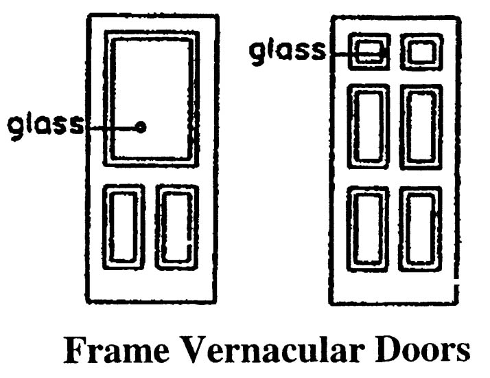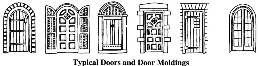 • Doors usually emphasized by adjacent spiral columns, pilasters, carved stonework, or patterned tiles. Less elaborate entrance doors of heavy wood panels, sometimes arched above, are also common.