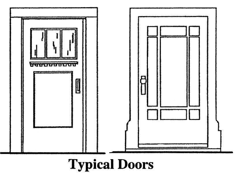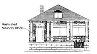 Exterior. Primary exterior material is brick with common or running bond; rough textured stucco; or rusticated rock-faced concrete block.
