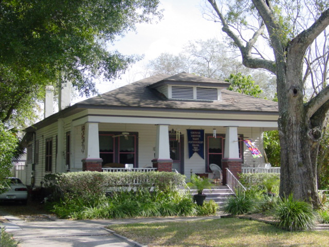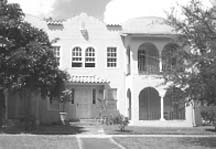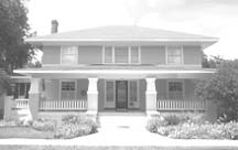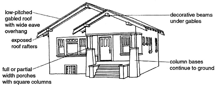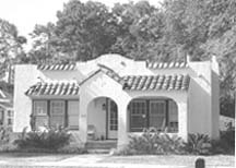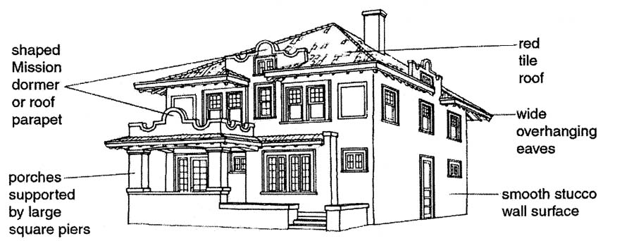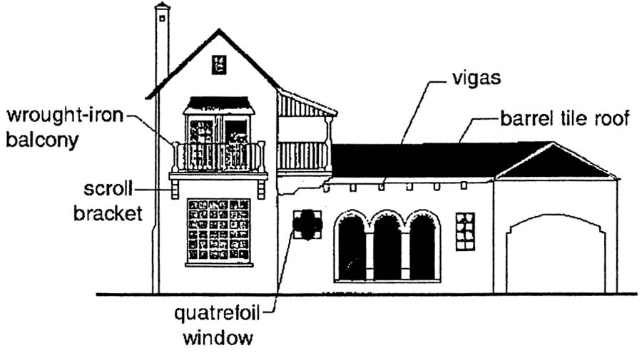 • Prominent one-story porches either at the entry area or covering the full width of the facade; these sometimes have arched roof supports to simulate the arcades of Hispanic buildings.