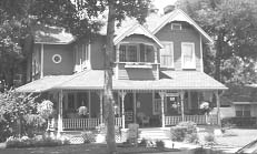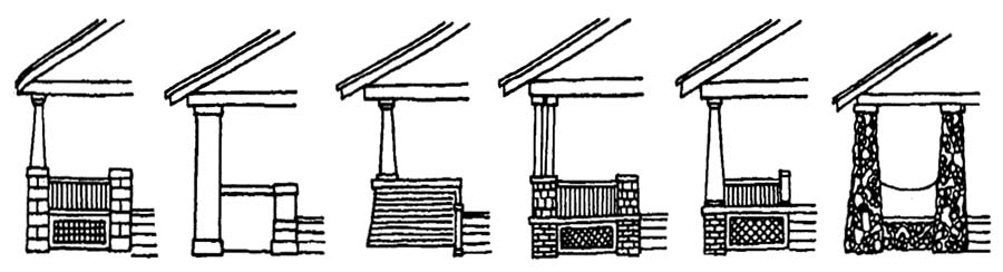 • Horizontal decorative emphasis achieved by using contrasting caps on porch and balcony railings; contrasting wood trim between stories; horizontal board-and-batten siding; contrasting colors on eaves and cornice; and selective recessing of only the horizontal masonry joints.
