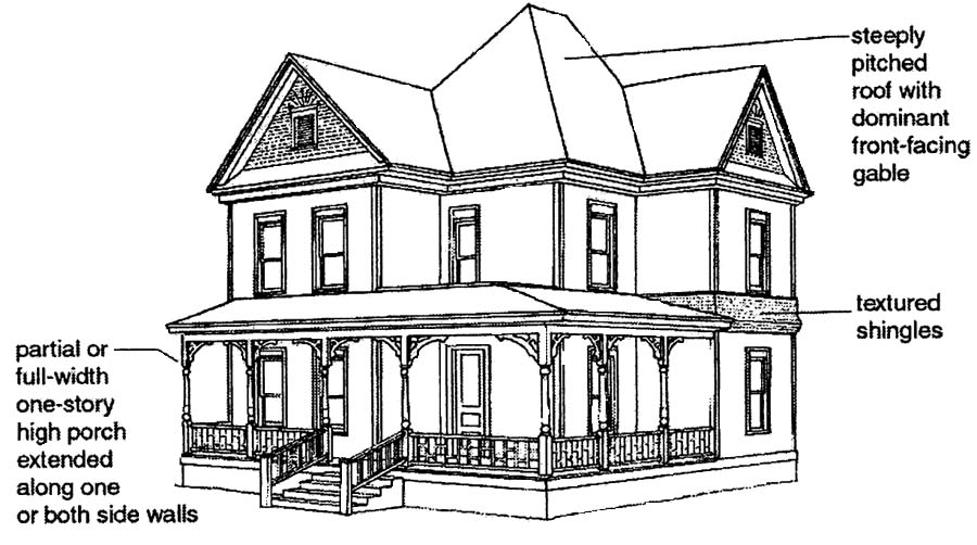 • Asymmetrical—The façade asymmetry is superimposed on a simple square or rectangular plan. Elaborate, rambling compound plans are found in some.
