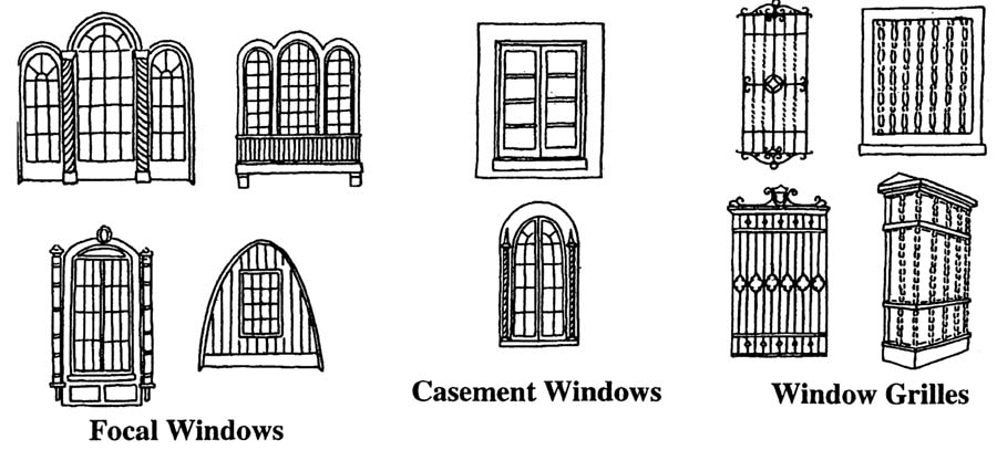• Decorative window grilles of wood or iron are common, as are similar balustrades on cantilevered balconies, which occur in a variety of shapes and sizes.