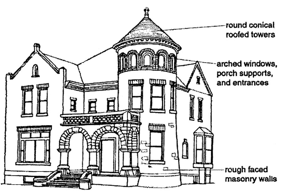 • Wide, round-topped arches occurring over windows, porch supports, or entrance.