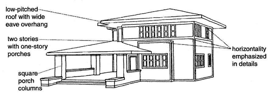 • Low-pitched roof, usually hipped, with widely overhanging eaves (peak sometimes projecting farther than the lower edges).