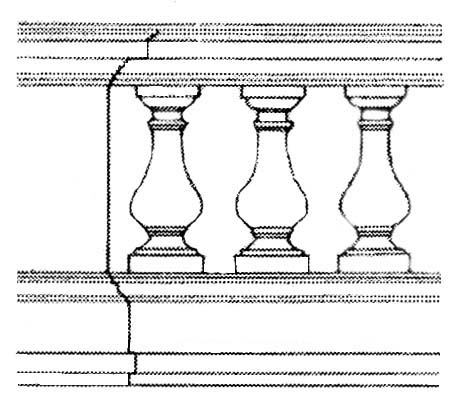 Balustrade - A row of balusters topped by a rail, serving as an open parapet, as along the edge of a balcony, terrace, bridge, staircase, or the eaves of a building.