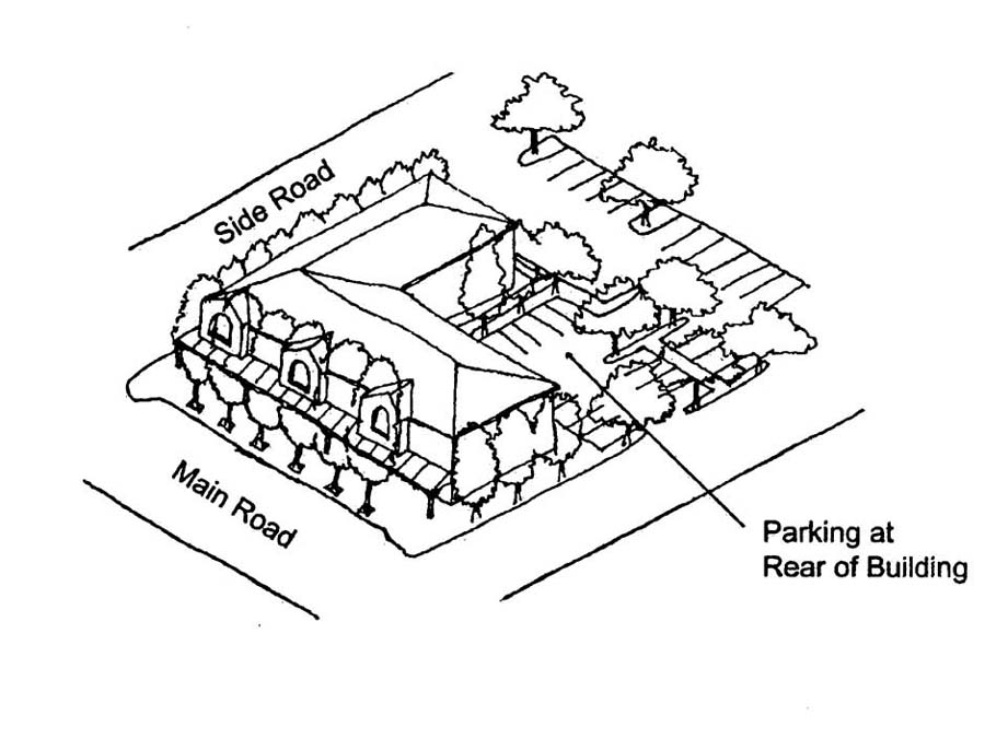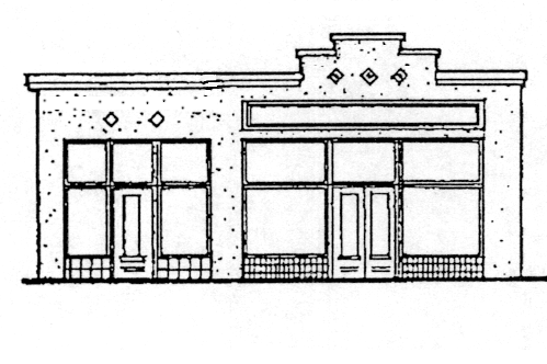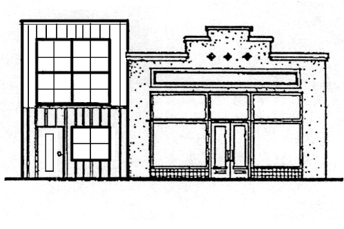 • Narrow front elevation facing the main street, which is the focus of the design and provides the building's identifying features.
