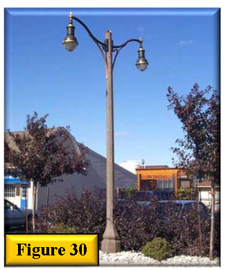 The style of light standards in a parking lot shall relate to the overall architectural design of the commercial uses. See figure 30 for example of pedestrian-scaled parking lot lighting.