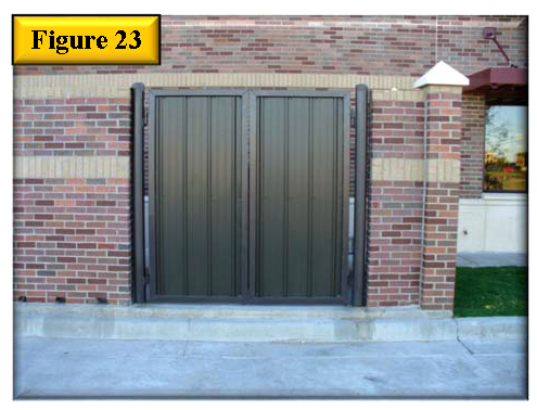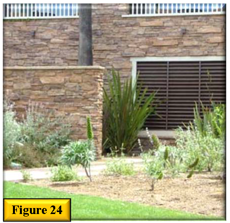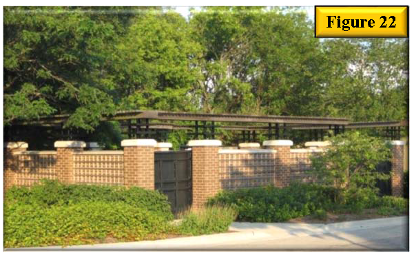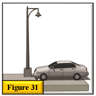 Parking area light poles placed outside of parking islands are permittable if the poles are located in an area that is protected or the pole foundation has been designed to accept minimal levels of vehicular impact. All exposed pole foundations shall be aesthetically designed to match the detailing of the primary structure (i.e. stucco finished with matching paint color) and shall be surrounded by a six-inch foundation curb. See figure 31.