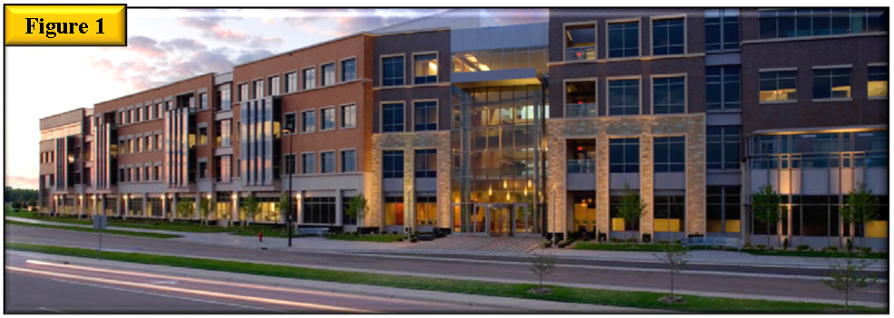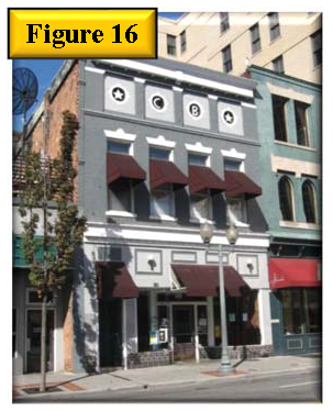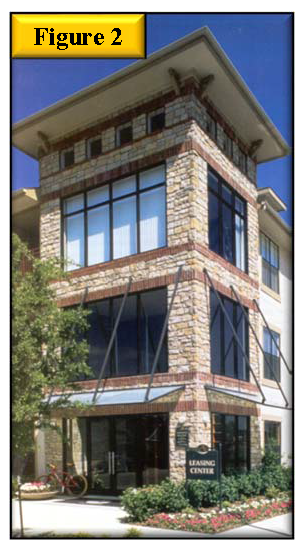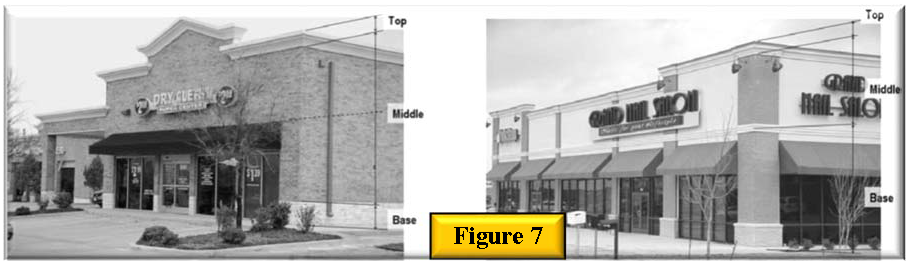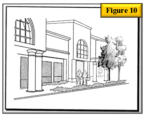 Building corners at primary intersections should be treated as prominent features, taking advantage of the opportunity to create a unique district identity by incorporating well-defined entrances and architectural features. See figure 2, building corners should be prominent.