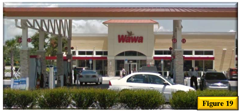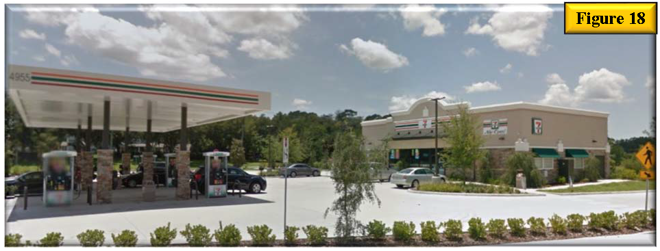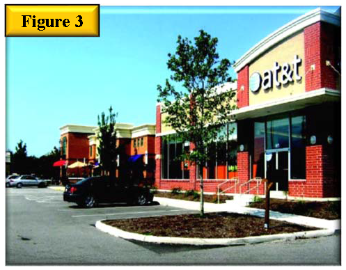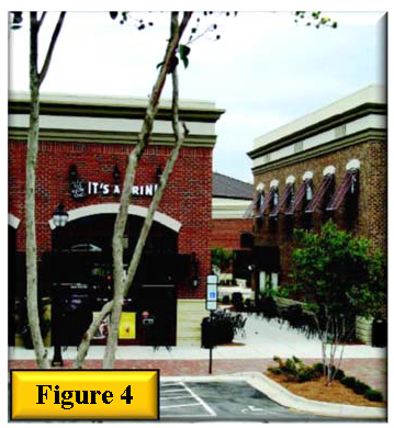 Include a pedestrian connection and/or landscape corridor between outparcel buildings. See figure 4 landscape corridor between two outparcels to help define building edge and figure 5, two buildings showing a pedestrian area between buildings.