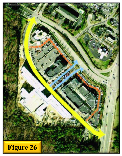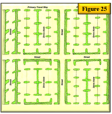 Vehicular circulation. Vehicular circulation within a site is critical for usability of a place. See figures 25 and 26 for examples of parking lots that provide a continuous flow of traffic through the lot. When laying out vehicular circulation the following standards shall be met: