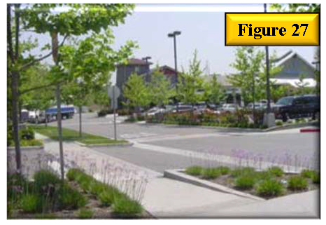 Parking areas shall be designed for pedestrian safety with walkways parallel to parking aisles. The design shall minimize the need for a pedestrian to cross parking aisles and landscape islands to reach building entries. See figure 28 for example of design that places walkways parallel to parking aisles.
