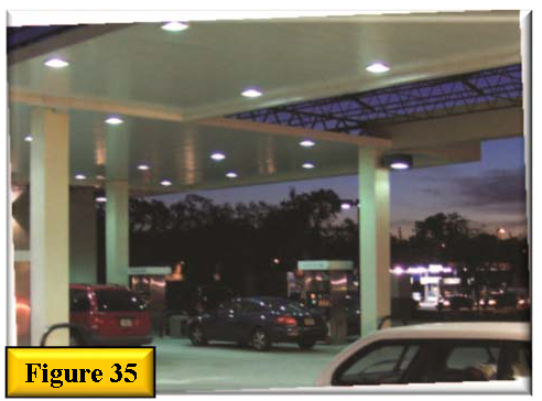 Light fixtures mounted on canopies shall be recessed so that the lens cover is recessed or flush with the bottom surface (ceiling) of the canopy. See figure 35 for example of recessed lighting at gas station canopy that creates a well-lit space without causing glare.