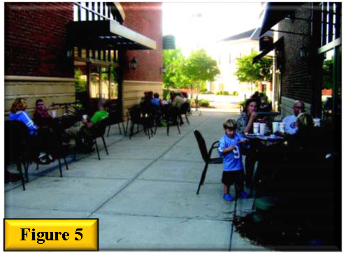 On commercial sites over five acres, multiple buildings shall be clustered to create a "village" feeling and simulate pedestrian activity. Plazas, patios and pedestrian walkways shall be included.