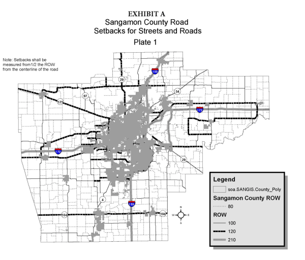 In addition to and not in lieu of any applicable bulk regulations otherwise prescribed in this title, setback lines are established along those streets and roads shown and illustrated on the map entitled "Setbacks for Streets and Roads, Sangamon County, Illinois, Plate No. 1," which Plate No. 1 is incorporated herein at the end of this Section.