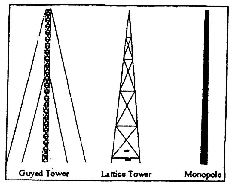 Self-supporting tower means an openwork structure of crossed strips or bars of metal standing alone without the use of guy wires, used to support antennas, surmounting appurtenances or other devices.