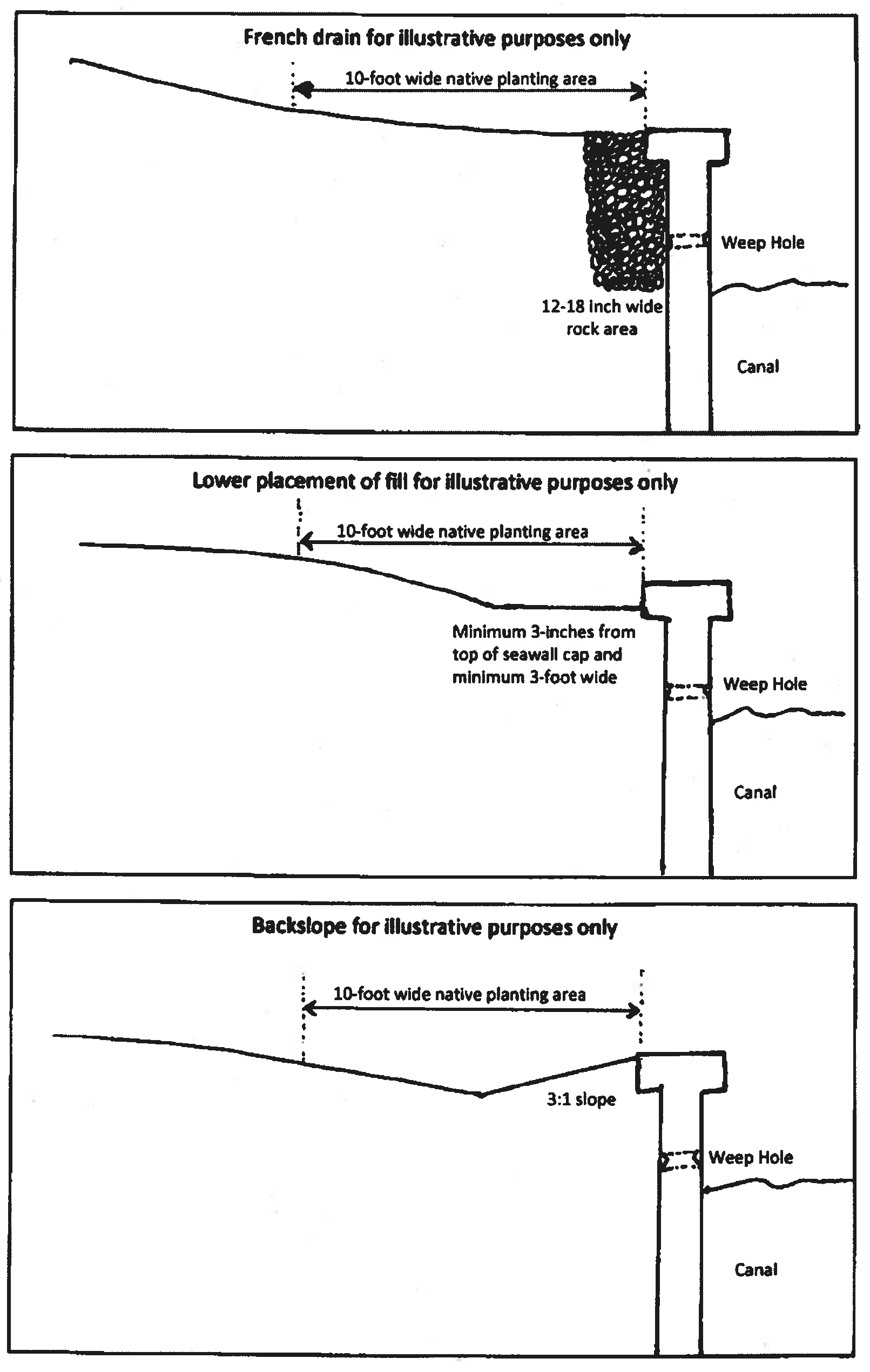 When the design of a replacement seawall or replacement seawall cap is at an elevation greater than the elevation of the existing structure, and when a new seawall is proposed, then the design must include a stormwater detention area landward and adjacent to the seawall to prevent runoff from rainfall and irrigation systems to directly enter the waterway. Examples of methods to detain runoff from direct discharge into the canal include, but are not limited to: (1) installation of a French drain adjacent to the seawall which is composed of crushed rock to encourage infiltration; (2) back sloping the fill; and (3) reducing the fill behind the new seawall cap, new seawall or replacement seawall to be three or more inches below the height of the seawall cap with a level surface for three or more feet in width (refer to illustrations below); and