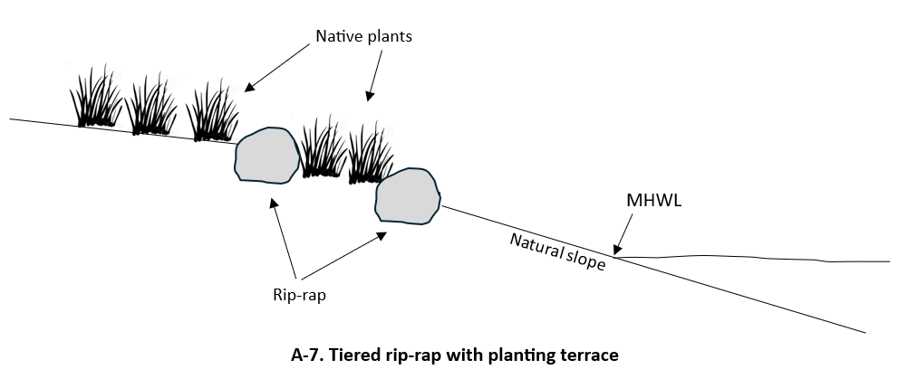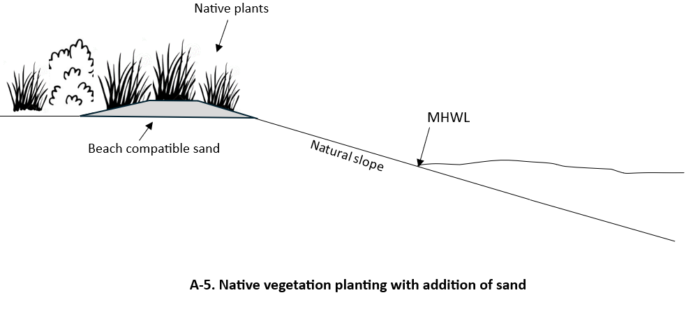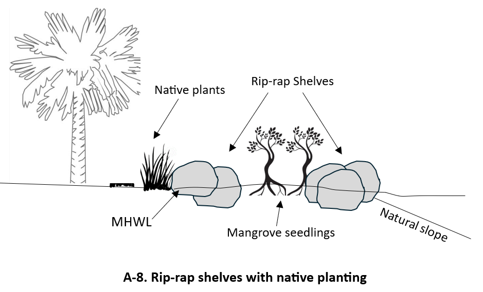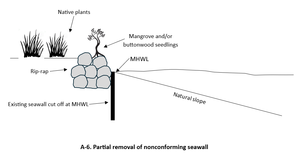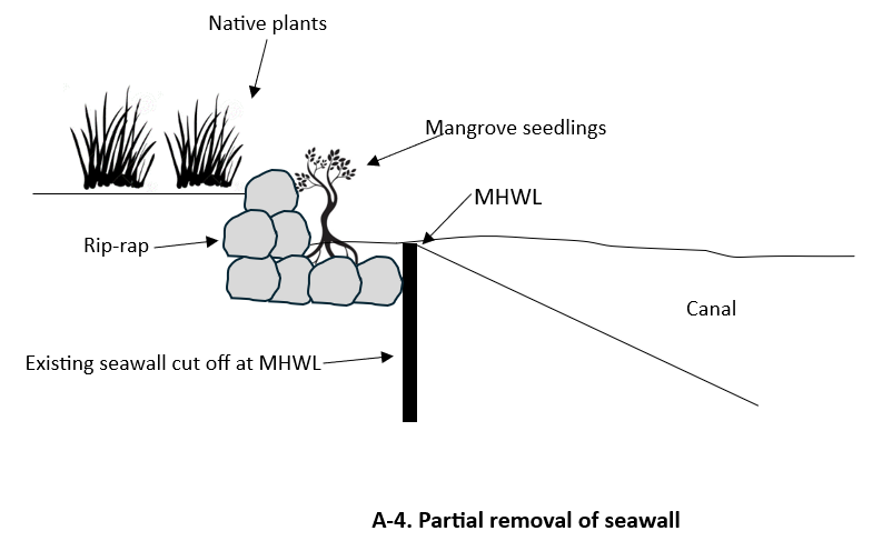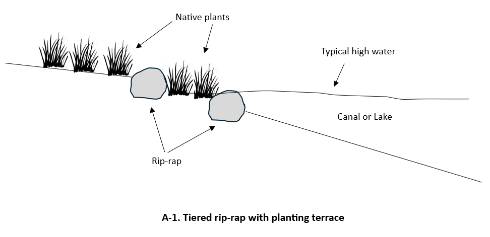 A ten-foot wide native groundcover planting area directly adjacent to and along the length of the seawall except for a maximum five-foot wide accessway to a dock. Native groundcover plants to be a minimum one-gallon container size planted on three-foot center; soil must be stabilized with a natural fiber filter cloth or native seashore paspalum sod at time of planting.