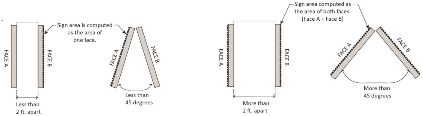 Double-Faced Signs. Where two faces of a double-faced sign are located two feet or less from one another at all points, or located at an interior angle of 45 degrees or less from one another, the sign area of double-faced signs is computed as the area of one face. Where the two faces are not equal in size, the larger sign face will be used. Where two faces of a double-faced sign are located more than two feet or greater than 45 degrees from one another, both sign faces are counted toward sign area.