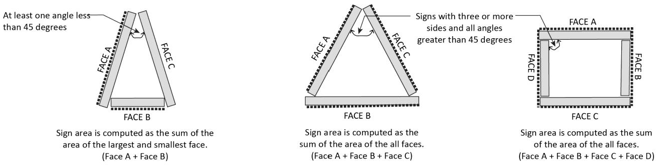 Multi-Faced Signs. On a three-faced sign, where at least one interior angle is 45 degrees or less, the area of two faces (the largest and smallest face) must be summed to determine sign area. In all other situations involving a sign with three or more sides, sign area will be calculated as the sum of all faces.
