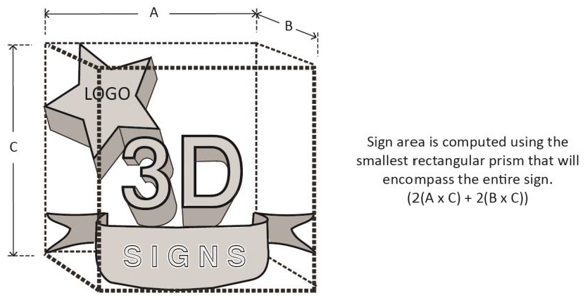 Three-Dimensional (3D) Signs. Signs that consist of, or have attached to them, one or more three-dimensional objects (i.e., balls, cubes, clusters of objects, sculpture, or statue-like trademarks), may have a sign area that is the sum of all areas using the four vertical sides of the smallest rectangular prism that will encompass the sign.