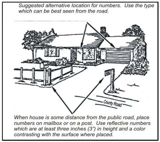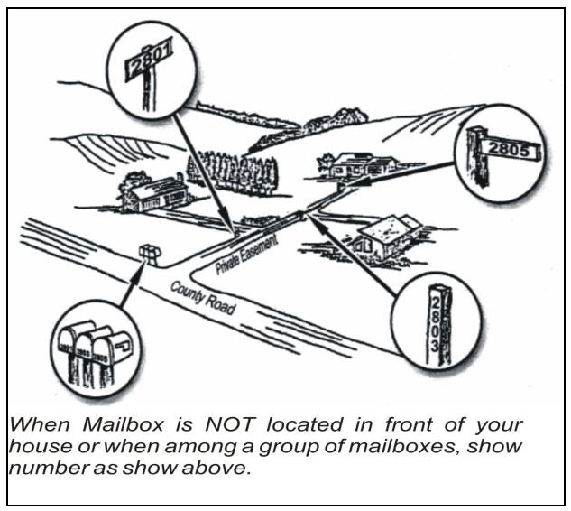Number location for obscured structures. Where a dwelling or business is not clearly visible from the road, address numbers shall be posted on a marker other than a mailbox. The address number shall be elevated at least three feet from the ground for clear visibility and easy directional identification, see Figure 7-2 (Display of Address Numbers) below. This Subsection also apples to the names of roads with private driveways or forks. The address numbers of the homes on a private driveway shall be posted on the named road and shall include a directional arrow to indicate location of the dwelling or business.