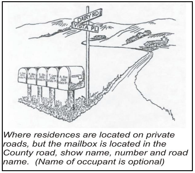 Mailboxes. When the mailbox of a dwelling or business is located on the same road as the dwelling or business, only the number need be posted on the box. When the mailbox and the structure it serves are located on separate roads, both the road name and address number are required to be placed on the mailbox, see Figure 7-3 (Address Numbers on Mailboxes) below.
