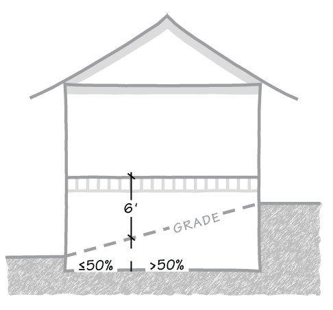 The finish floor level immediately above such under-floor space shall not be more than six feet above grade for more than 50 percent of the under-floor area; except that on lots where the "-n 1 " combining designation applies, a basement threshold of four feet (instead of six feet) shall apply (see § 3.40.030). Window wells, as defined and required for egress by the California Building Code (CBC) and California Residential Code (CRC), shall be limited to ten percent above the minimum dimensions required by the CBC and CRC.