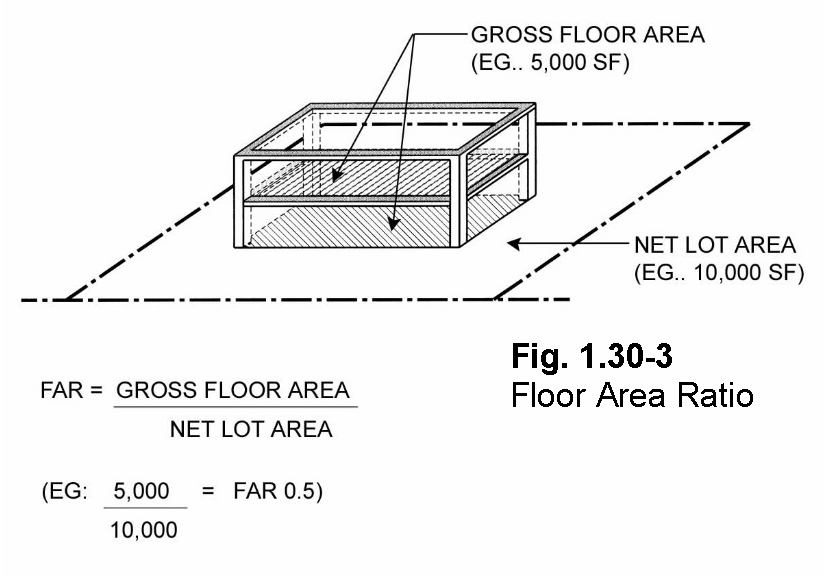 Floor-area ratio (FAR): Determined by dividing the gross floor area of a specified building(s) on a lot by the net lot area; provided, however, that on flag lots, all portions of fee access corridors which are less than 25 feet in width shall be excluded from floor area calculations.
