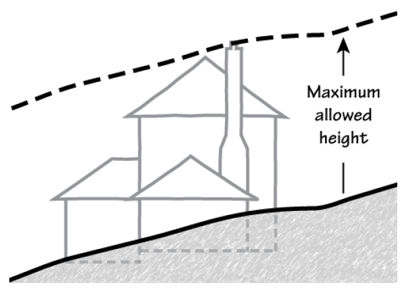 Height: The dimension measured by the vertical distance from the final grade to the top of a building or structure. On sloping lots or lots with irregular topography, height shall be measured vertically upward from a hypothetical surface representing the final grade as projected through the structure site (see Figure 1.30-4b for measurement details).