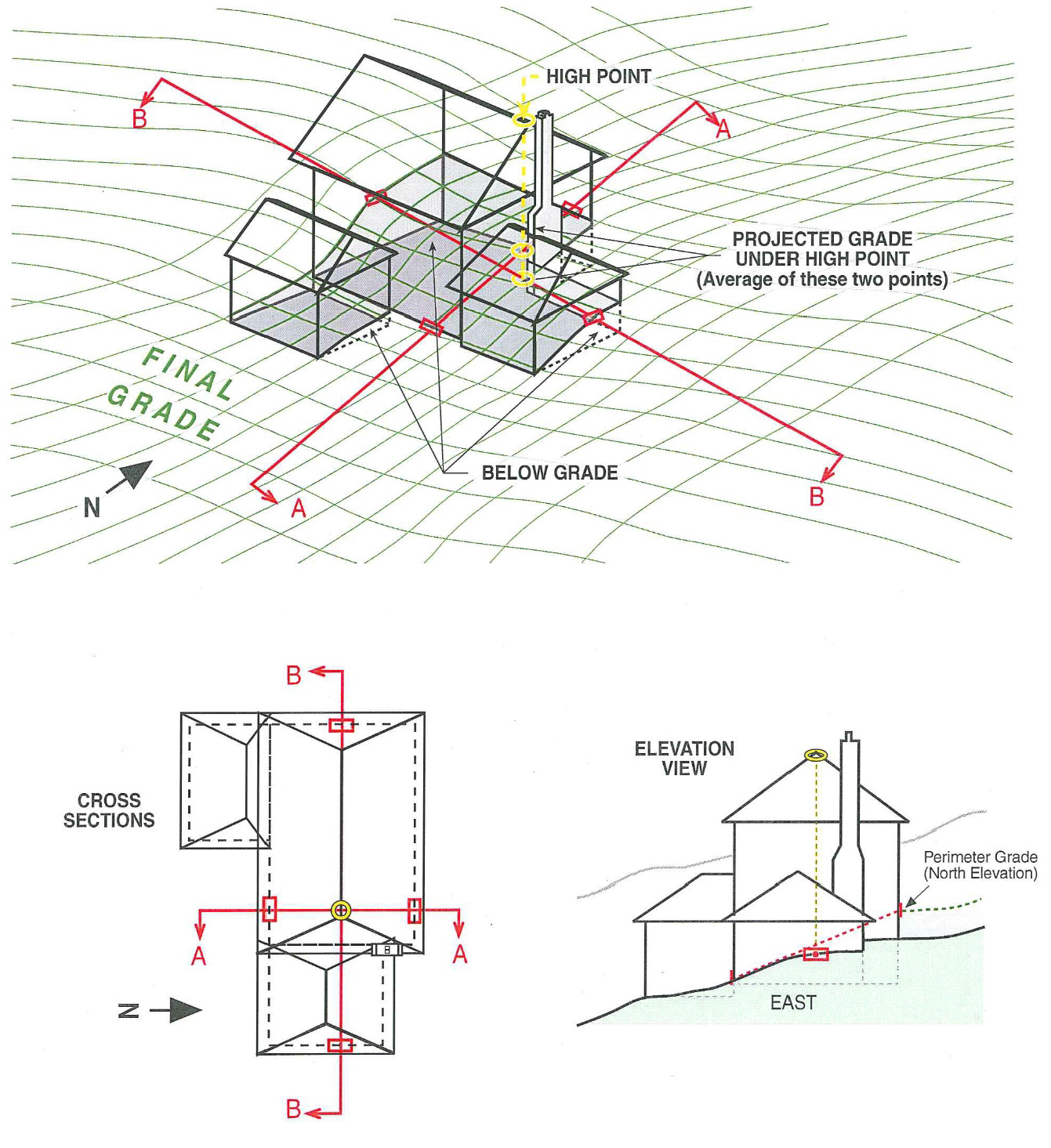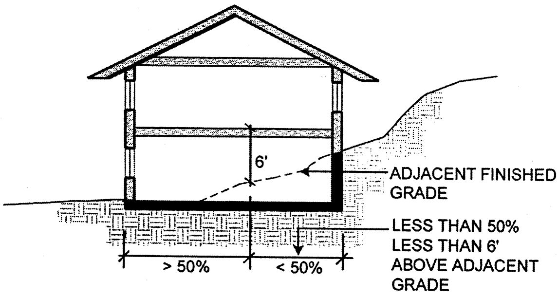 For the purpose of this definition, "grade" shall be final grade at the building's perimeter, and shall be projected through the subject basement space when appropriate.